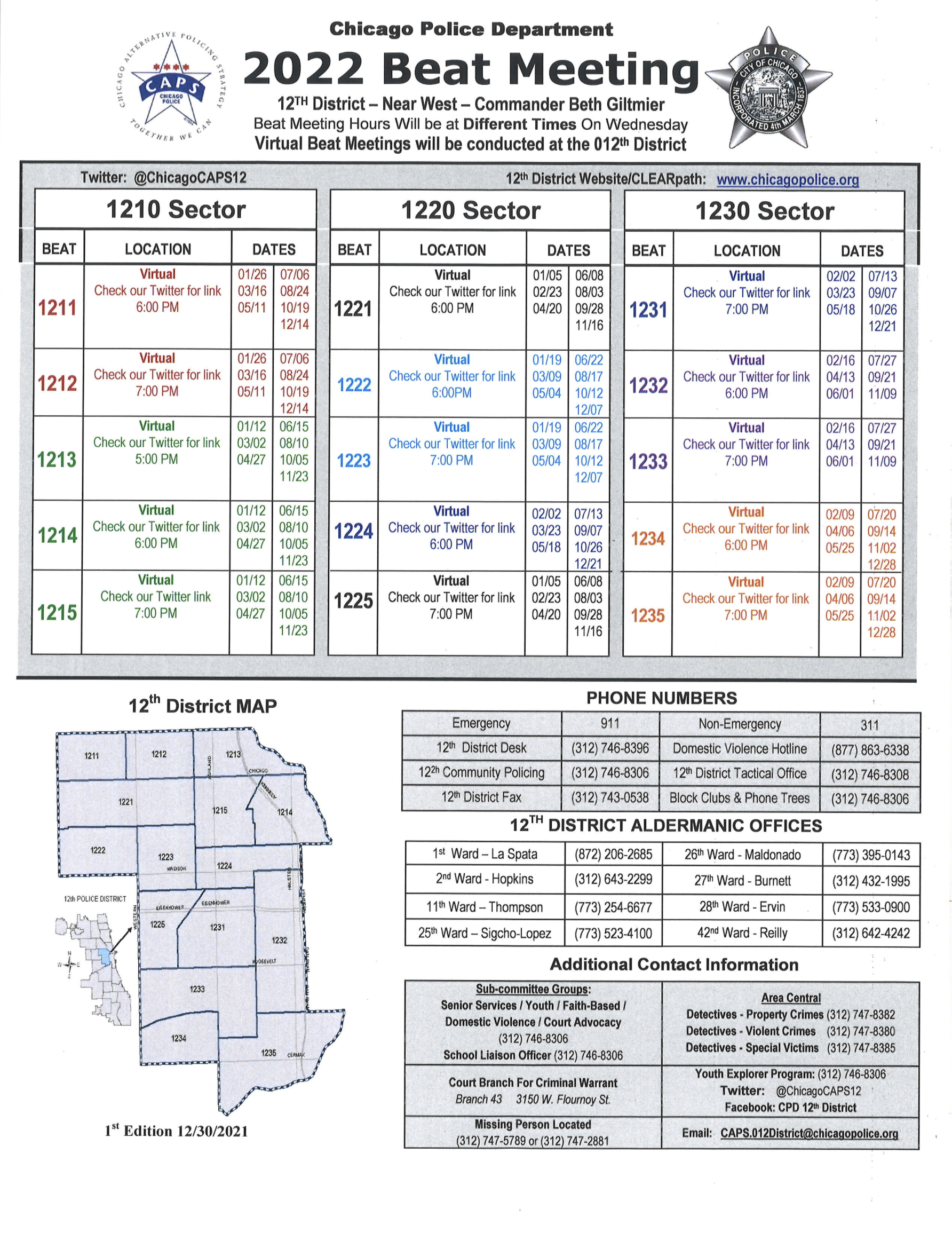 Please refer to the above flyer for public Chicago Alternative Policing (CAPS) meetings . Times and dates are subject to change, so check the 12th District’s Twitter account for the most up-to-date information.